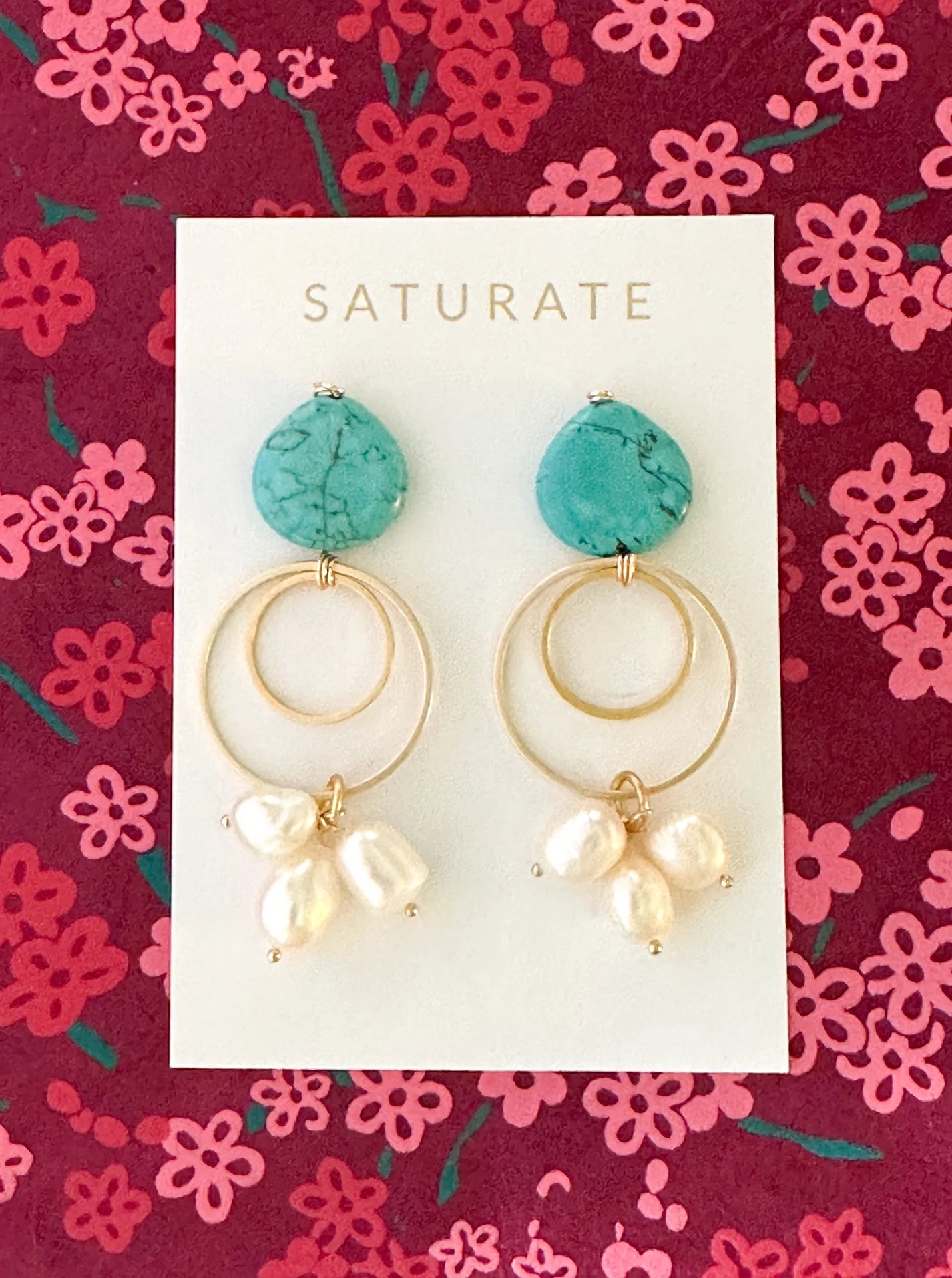 Add a touch of elegance to your outfit with these Saturate Sawyer Earrings. Made with gold, turquoise stone, and pearl, these dangle earrings are the perfect addition to any jewelry collection. Enhance your style and make a statement with these versatile and timeless earrings.