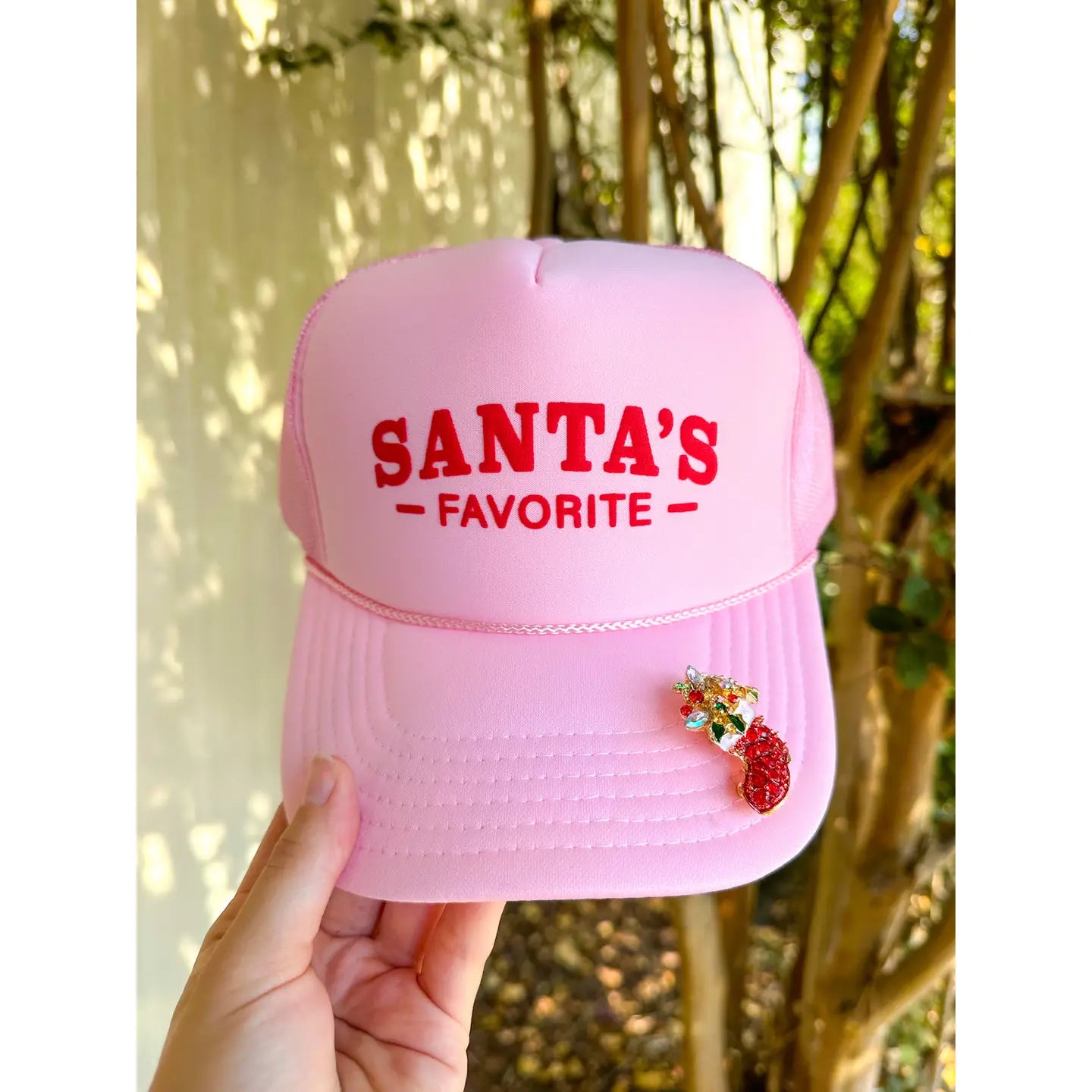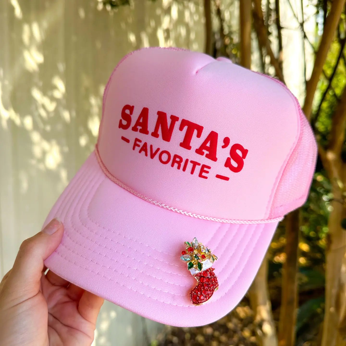 Celebrate the season in style with the Southern Bliss Santa's Favorite Trucker Hat. A delightful twist on holiday tradition in soft blush pink. The breathable mesh panels keep you comfortable through festive celebrations and winter adventures alike.