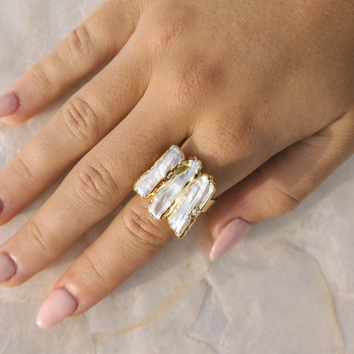 The Voyage Natural Pearl Ring brings bohemian elegance to your hand. This 24k gold plated piece features an elongated faux freshwater pearl and is waterproof for everyday wear. With its adjustable design, it fits comfortably on any finger, making it the perfect accessory for those who value both style and practicality.