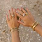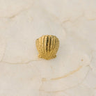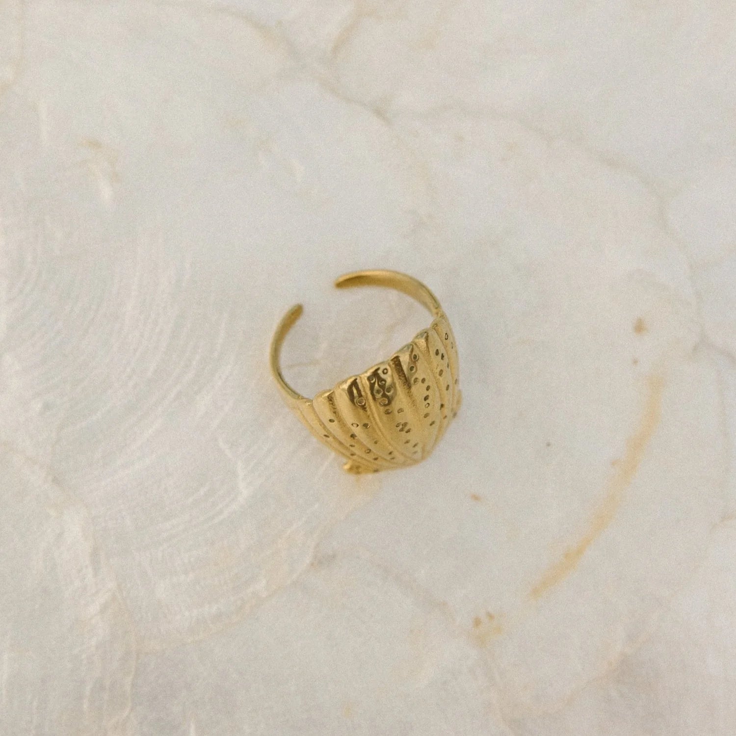 The Voyage Scallop Shell Ring is bohemian elegance at its finest. This adjustable 24k gold plated design features a charming scallop shell motif and stays tarnish-free through everyday wear. Made to fit any finger size comfortably, it's the ideal piece for those seeking coastal-inspired jewelry that adapts to their lifestyle.