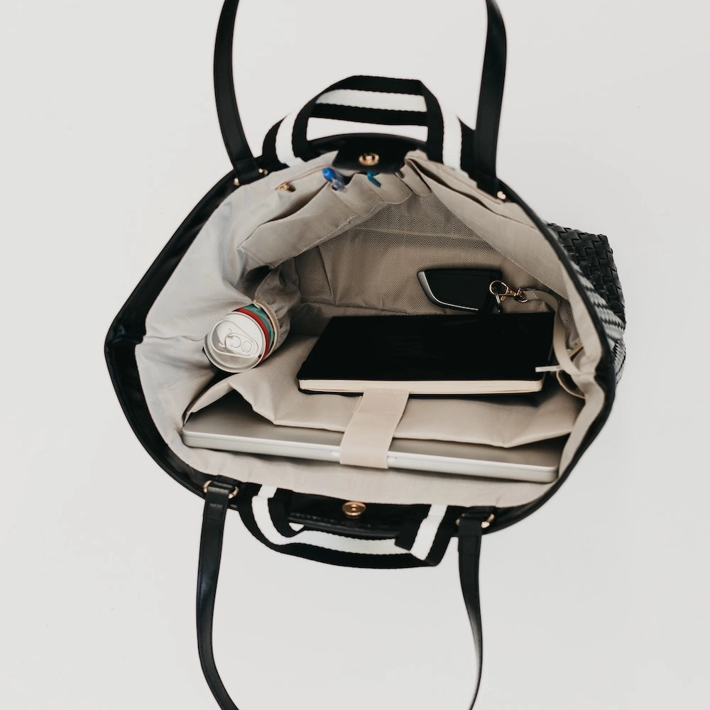 The Pretty Simple Woven Tiffany Organizer Tote keeps you prepared for whatever the day brings. Made from durable woven vegan leather with a vegan leather shoulder strap and striped canvas hand strap, it closes securely with a snap. The thoughtfully designed interior is functional, versatile, and ready for anything.