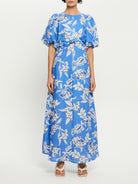 The Kivari Ren Maxi Dress dazzles with a vibrant blue print and crisp white florals for a fresh, timeless look. Its twist-front bodice and round neckline keep it feminine, while short bubble sleeves with soft elastic cuffs add playful charm. Perfect for sunlit days and evening vibes!