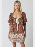 The Olivaceous Cooper Brown Dress features a charming ruffle detail at the neck and playful puff sleeves with elastic ruffle cuffs. Tied at the neck for an adjustable, flirty finish, this dress brings a fun, feminine touch to any occasion.