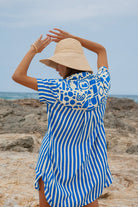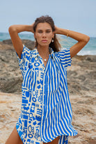 The Palm Collective Geo Shirt Dress is soft and luxe, featuring an exclusive geo print and matching blue stripe. Its relaxed boyfriend fit, concealed buttons, and longer back hem make it a beachy, casual Friday fave.
