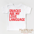 This Madi Moosh Snacks Are My Love Language Tee celebrates snack lovers everywhere with a fun, relatable design. Perfect for children who know that treats are the ultimate expression of joy. Comfortable and stylish, it's the ideal way to show your kiddo you speak their language.