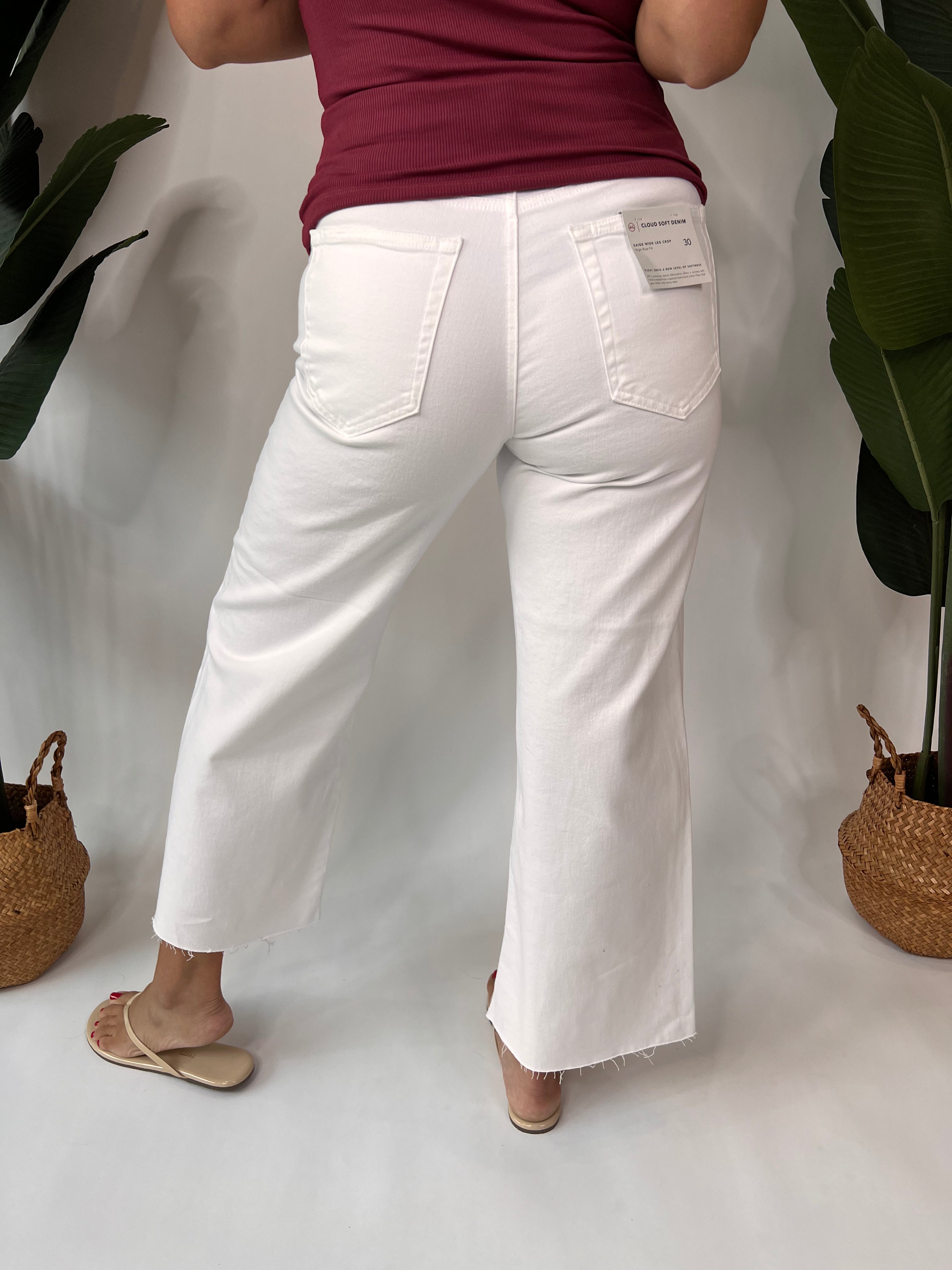 Upgrade your white denim this Spring with the new AG Saige Wide Leg Jeans. These fashion forward wide leg, cropped jeans hug your waist with a high rise fit and a frayed hemline.