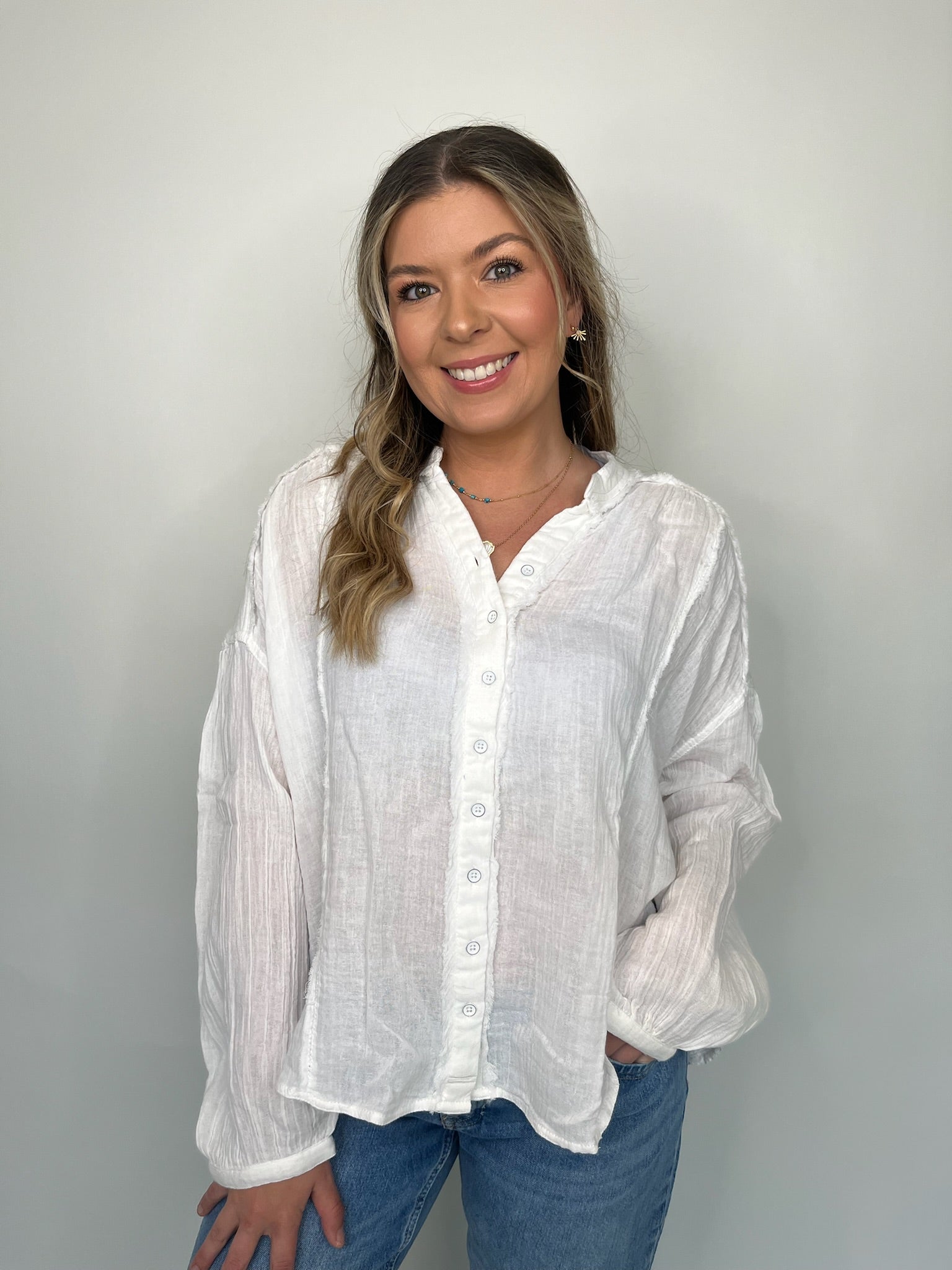 Rock the casual and chic look with the Free People Valley Double Cloth Shirt. Made with double-cloth cotton for ultimate comfort, this shirt features a banded collar, button-front closure, and seamed details. The drop-shoulder balloon sleeves add a playful touch while the rounded hem adds a flattering silhouette.