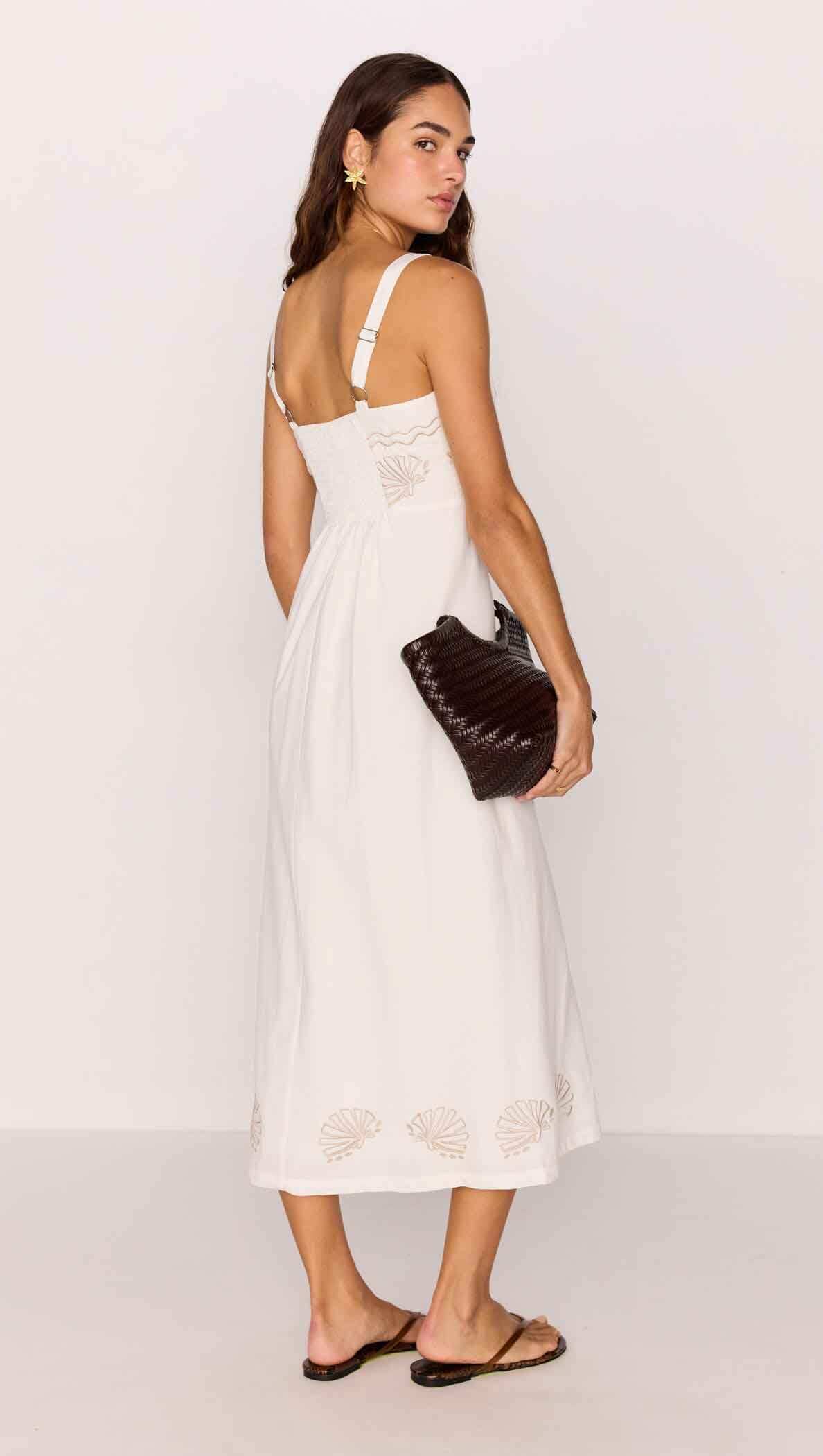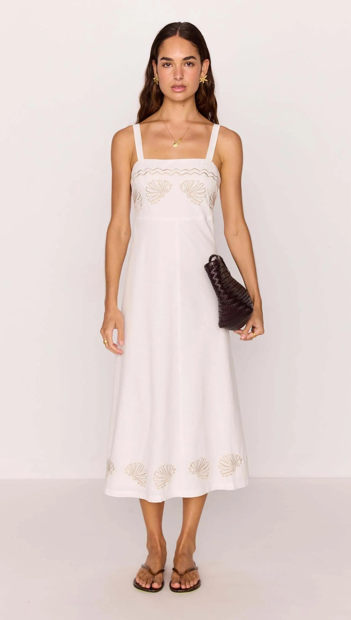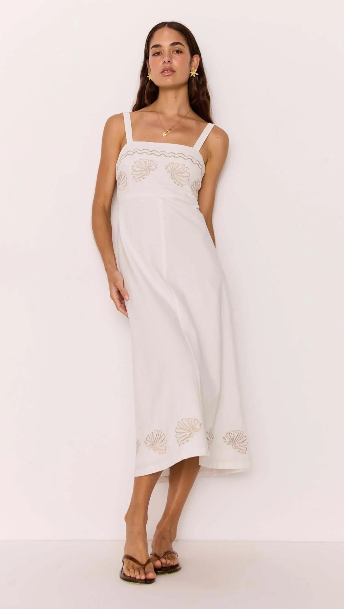 The Mink Pink Hera Embroidered Midi is the dress you'll reach for again and again. Adorned with delicate shell embroidery at the neckline and hem, it pairs a fitted bodice with a flowing A-line skirt that's pure elegance. The lightweight cotton-viscose fabric is soft, breathable, and perfect for warm weather, whether you're enjoying long lunches or golden hour moments.