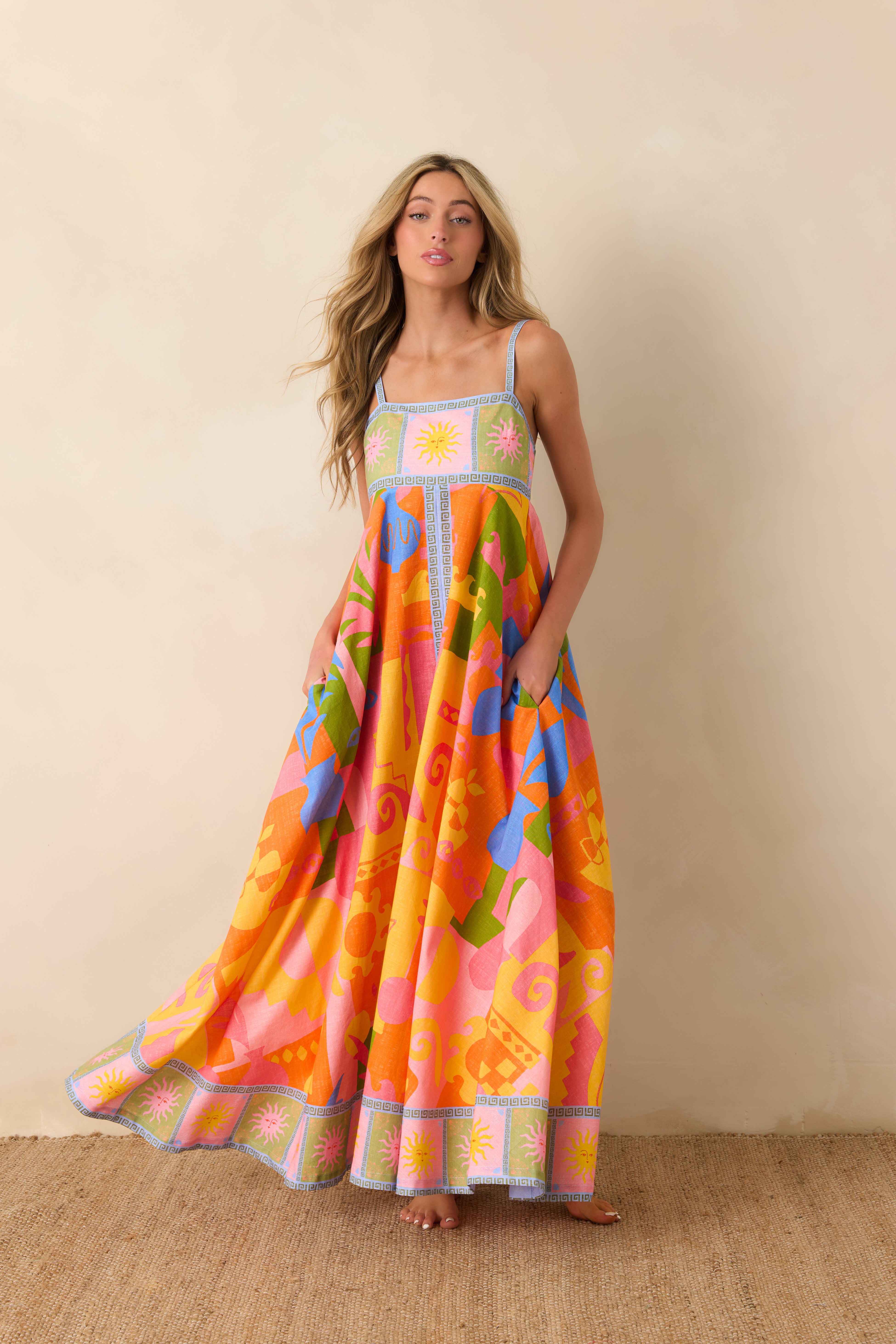 Bright, bold, and made to turn heads, the Paradisa Atlantis Maxi Dress brings a playful burst of color to your wardrobe. Featuring a flowy silhouette with delicate straps and an eye catching, art inspired print, it moves effortlessly with you from day to night. Perfect for beach days, vacations, or anywhere you want to stand out without even trying.