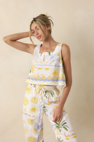Easy, breezy, and full of coastal charm, the Paradisa Bahia Bay Top is your go to for effortless warm weather style. Featuring a relaxed, slightly cropped fit with wide straps and a playful sun and palm print, it gives off that laid back, beachy feel without even trying. It pairs perfectly with the matching bottoms or your favorite denim for an easy, throw on and go look.
