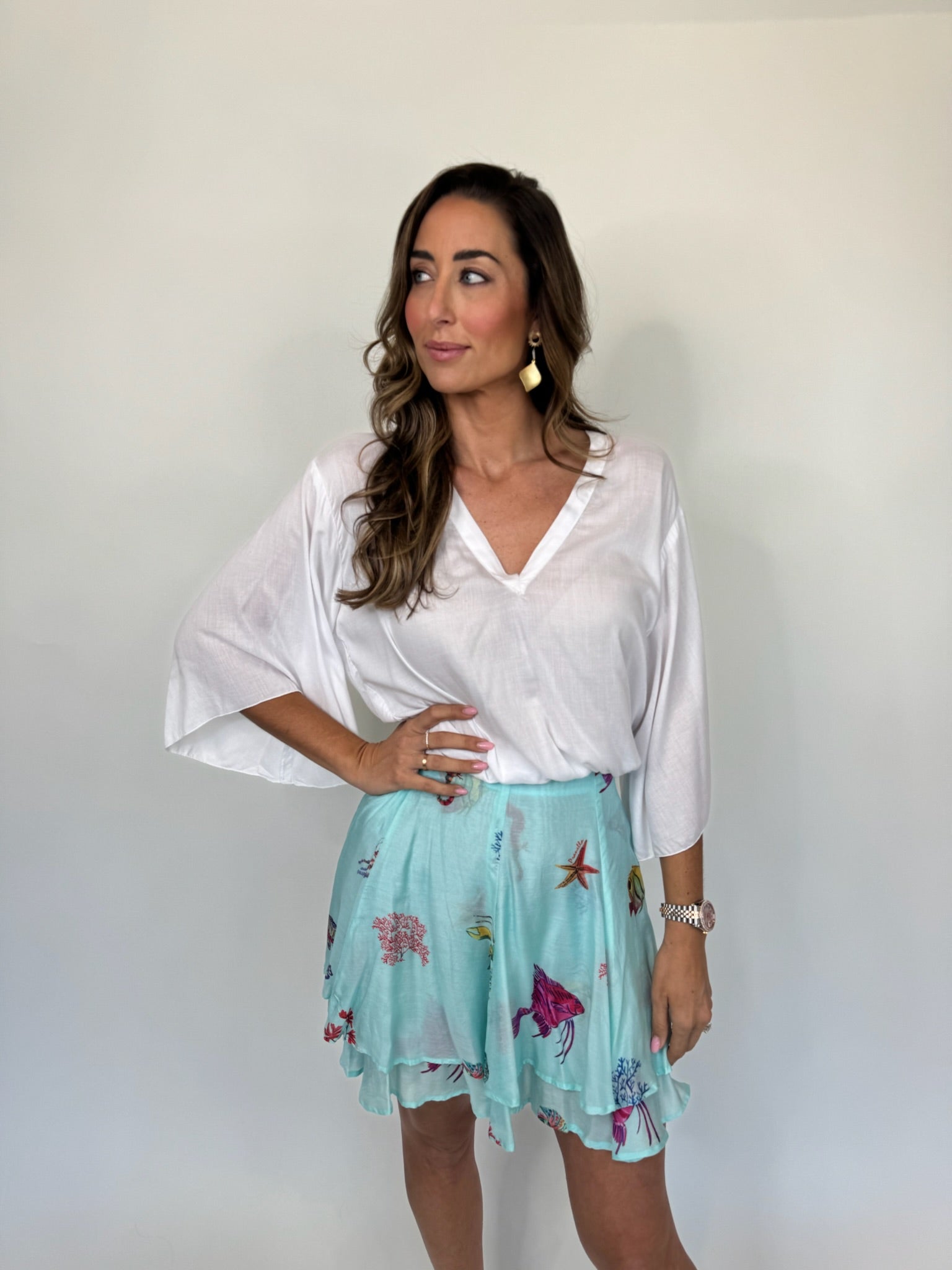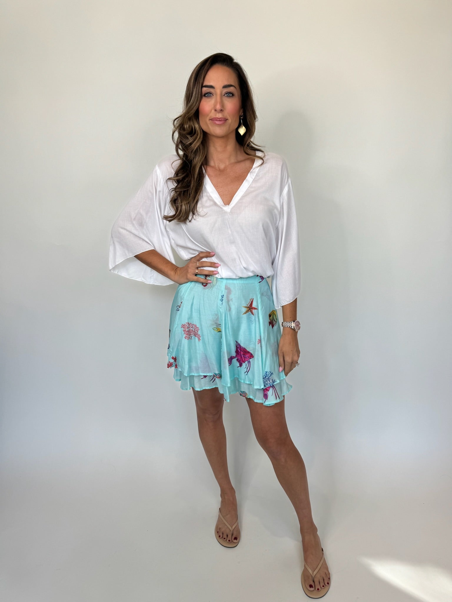 Be a beach babe with the Pranella Indy Mini Skirt! This lightweight and flowy skirt features a fun ocean print, perfect for a day by the water. Get ready to turn heads and have some fun in the sun with this quirky and playful skirt.