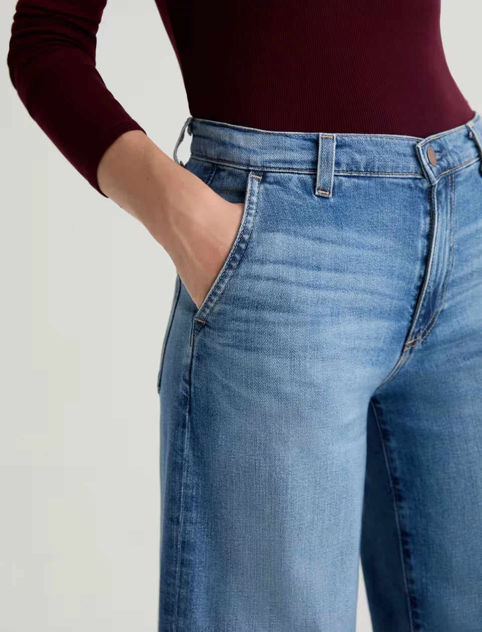 The AG Stella Jean combines comfort and style with its low-slung, wide-leg palazzo cut and mid-rise fit. Made from stretch denim aged for a naturally worn-in look, these jeans move with you for effortless cool all day long.