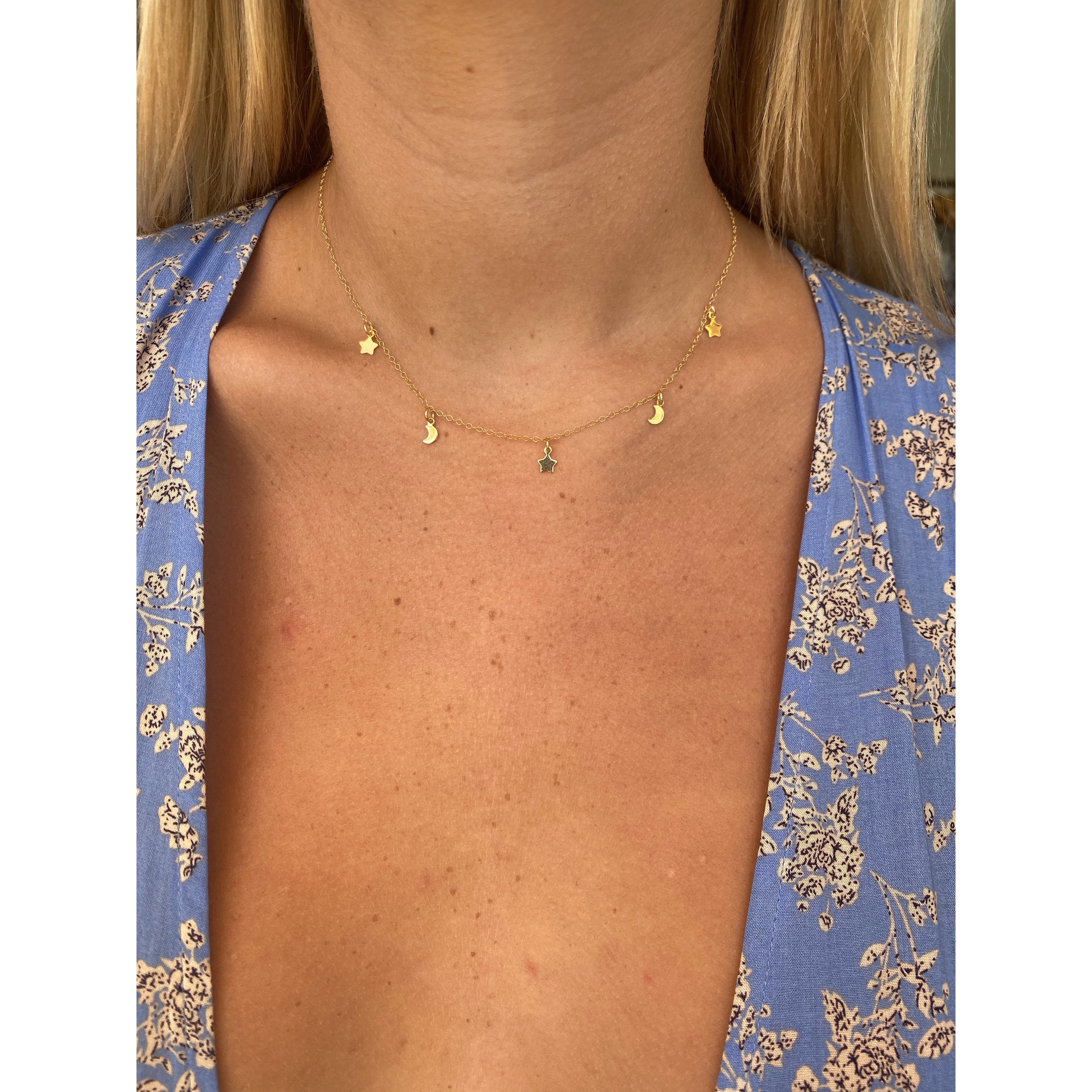 A girl can never have enough chokers, they're perfect layering pieces! This choker features a thin gold chain with small moon and star pendants. Layer with longer gold necklaces or wear alone for an everyday necklace!