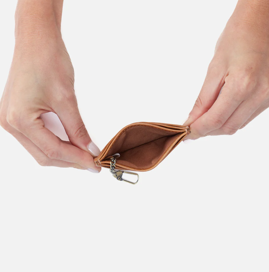 A leather card case. Max has a minimalist design, making it the perfect fit for smaller bags.