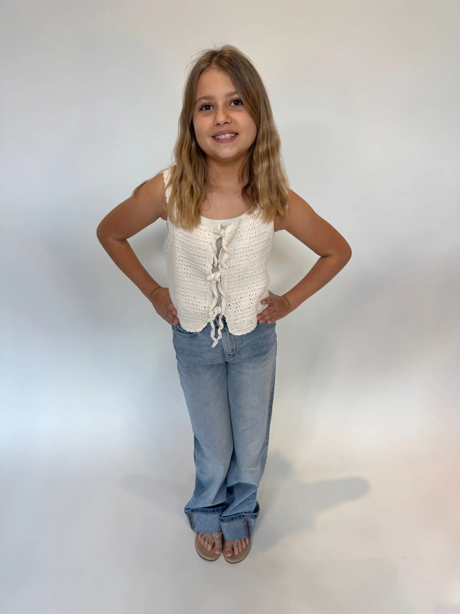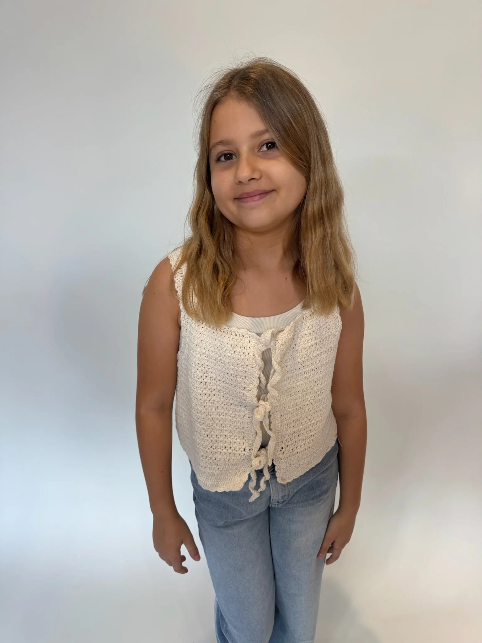 This Skemo Kid Azure Crochet Tank W/Tie Vest brings effortless style with adjustable front ties that let her customize the look. The breathable crochet construction keeps her comfortable all day long, while the tie-front design adds a modern edge. Perfect for layering or wearing alonr, it's a versatile staple that pairs with everything.