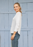 Step up your style with the Wooden Ships Crochet Anchor 3/4 Sleeve V! This top features a beautiful crochet knit design and a bold knit anchor on the front. The v-neck adds a touch of elegance and gives you a flattering neckline. Perfect for adding a nautical touch to any outfit.