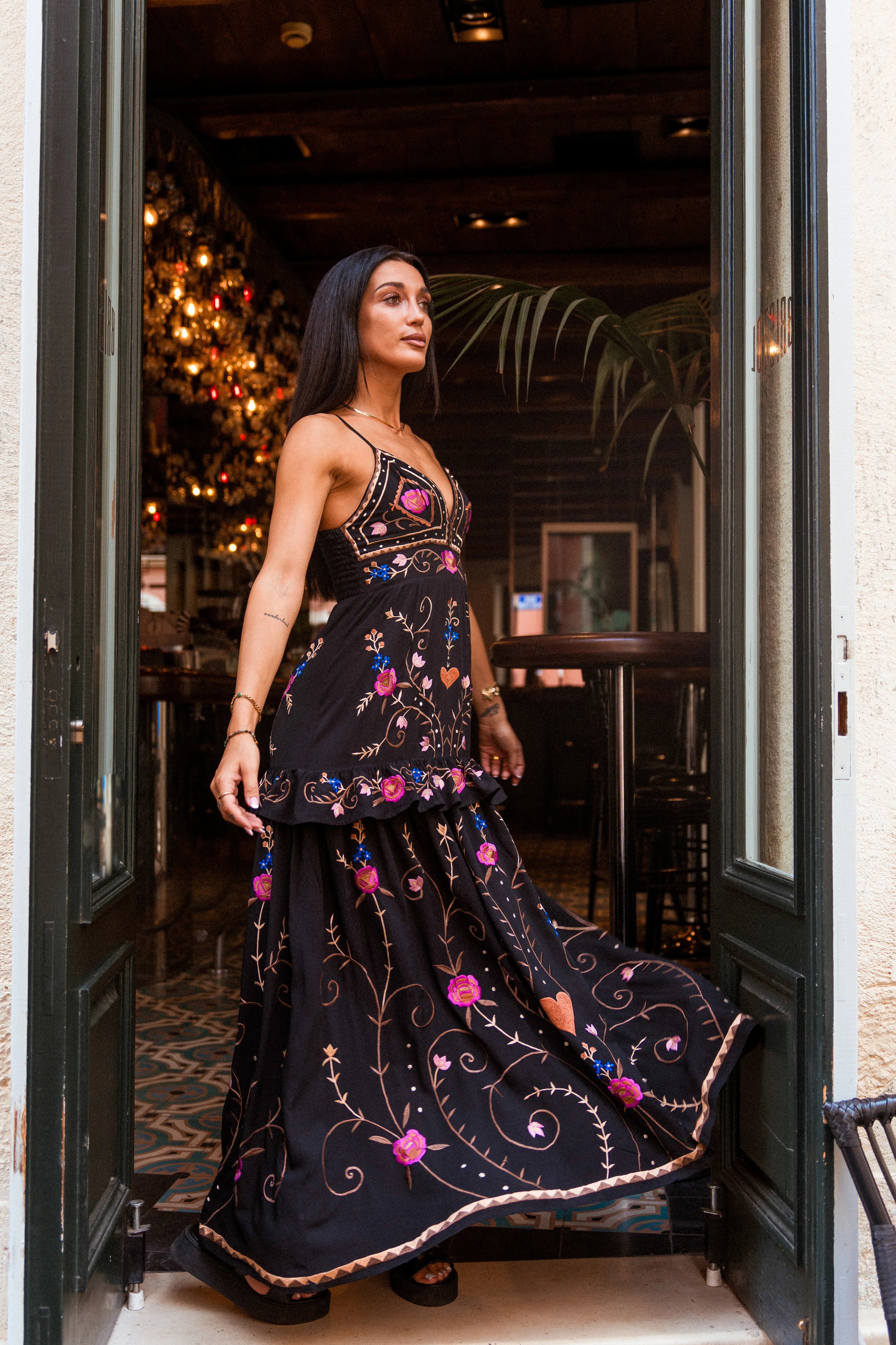 The Zaimara Valletta Maxi brings the wow with delicate floral embroidery that pops. This sassy number features adjustable straps and a stretchy shirred back for that perfect fit. The bouncy cascading ruffle adds an extra swish to your step.